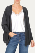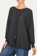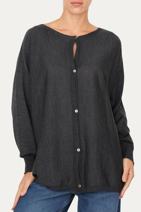 Cardigan che unisce la leggerezza della lana pregiata a un design minimal e sofisticato nella sua variante antracite, semplice e neutra.