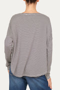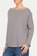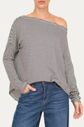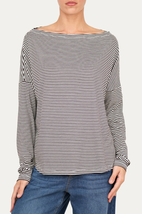 Questa maglia a righe Kansas con scollo a barca, da indossare sia regolarmente che con una spalla scesa per un look più sensuale e casual.