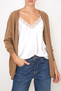 Cardigan che unisce la leggerezza della lana pregiata a un design minimal e sofisticato nella sua variante biscotto.