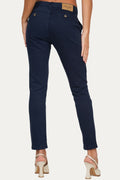 In un raffinato tessuto di cotone gabardina nella versione blu, versatile ed elegante, questo pantalone chino unisce lo stile classico al comfort moderno. La linea pulita ed essenziale valorizza la silhouette senza costringere, mentre la leggera percentuale di elastan assicura libertà di movimento per tutta la giornata. Un capo versatile e curato nei dettagli, perfetto per outfit eleganti ma pratici, ideali dall’ufficio al tempo libero.