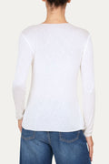 Un capo essenziale ma mai banale. Questa maglia in misto cashmere panna, chiaro e luminoso, avvolge il corpo con una sensazione di calore e comfort, mantenendo una linea semplice e pulita. Lo scollo valorizza con naturalezza, mentre la vestibilità dritta la rende perfetta sia come sotto giacca che da indossare sotto maglioni e capispalla nelle giornate più fredde. Un basico raffinato, indispensabile nel guardaroba.
