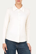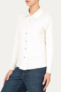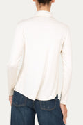 Morbida e luminosa, la tonalità burro della camicia in jersey di viscosa avvolge con la sua naturale raffinatezza grazie al suo colore caldo e neutro. Il taglio semplice con collo classico e chiusura a bottoni in madreperla, valorizza la figura con naturalezza. Ideale per look sofisticati e armoniosi.