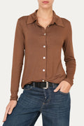 Calda e raffinata, la camicia moka in jersey di viscosa regala un tocco di sobria eleganza. La tonalità intensa e naturale valorizza ogni incarnato. Il taglio semplice con collo classico e chiusura a bottoni in madreperla, valorizza la figura con naturalezza. Ideale per look quotidiani dal gusto contemporaneo.