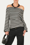 La trama a righe alternate nero si arricchisce di un sottile dettaglio in lurex, che dona luce e carattere al capo.