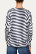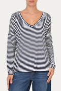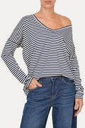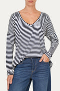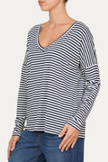 Il blu notte, profondo e avvolgente, dona un’allure discreta e chic. Le righe spezzano la monotonia del tinta unita, creando un effetto moderno. La viscosa fluida e lo scollo a V slanciano la figura, mentre la vestibilità over aggiunge un tocco rilassato ma curato.