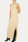 Variante noce, luminosa ma neutra, questo abito lungo senza maniche esprime una femminilità discreta e contemporanea. Lo scollo rotondo pulito mette in risalto il collo e le spalle, mentre lo spacco frontale dona slancio e sensualità senza eccessi. Una linea minimal, perfetta per look versatili che accompagnano la giornata con stile, ma anche un'occasione più speciale.