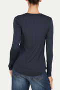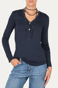 In una tonalità blu notte, elegante e profonda, questa blusa in viscosa unisce praticità e femminilità con equilibrio raffinato. Il design essenziale è arricchito da dettagli curati come lo scollo a V con colletto aperto e i due bottoni in madreperla, che donano un tocco di luce e raffinatezza. Morbida e leggermente elasticizzata, è ideale sotto giacca o indossata da sola per look versatili, dal casual chic al più ricercato.