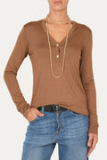 In una tonalità coloniale, calda e raffinata, con un tocco vintage elegante, questa blusa in viscosa unisce praticità e femminilità con equilibrio raffinato. Il design essenziale è arricchito da dettagli curati come lo scollo a V con colletto aperto e i due bottoni in madreperla, che donano un tocco di luce e raffinatezza. Morbida e leggermente elasticizzata, è ideale sotto giacca o indossata da sola per look versatili, dal casual chic al più ricercato.