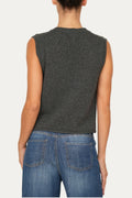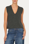 Questo gilet smanicato a costine in misto cashmere nella versione antracite è un capo versatile e raffinato, perfetto per le stagioni intermedie e per i look a strati. La lavorazione a maglia sottolinea la morbidezza e il comfort del tessuto. Il taglio leggermente corto con scollo a V dona una linea essenziale che valorizza la figura con naturalezza, rendendo il capo adatto a molteplici abbinamenti: portato da solo per uno stile minimal e moderno, oppure sopra camicie e bluse per un tocco sofisticato e casual chic.