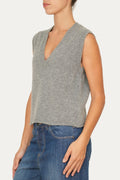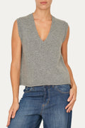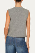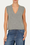 In un morbido grigio, questo gilet smanicato a costine in misto cashmere è un capo versatile e raffinato, perfetto per le stagioni intermedie e per i look a strati. La lavorazione a maglia sottolinea la morbidezza e il comfort del tessuto. Il taglio leggermente corto con scollo a V dona una linea essenziale che valorizza la figura con naturalezza, rendendo il capo adatto a molteplici abbinamenti: portato da solo per uno stile minimal e moderno, oppure sopra camicie e bluse per un tocco sofisticato e casual chic.