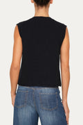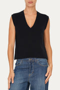 In un'intramontabile navy, questo gilet smanicato a costine in misto cashmere è un capo versatile e raffinato, perfetto per le stagioni intermedie e per i look a strati. La lavorazione a maglia sottolinea la morbidezza e il comfort del tessuto. Il taglio leggermente corto con scollo a V dona una linea essenziale che valorizza la figura con naturalezza, rendendo il capo adatto a molteplici abbinamenti: portato da solo per uno stile minimal e moderno, oppure sopra camicie e bluse per un tocco sofisticato e casual chic.