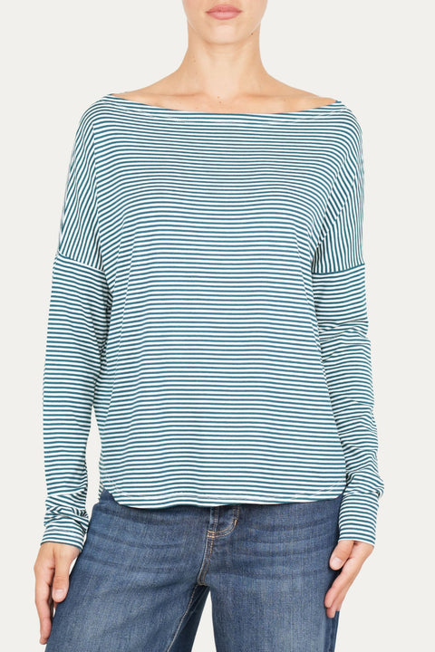 Maglia a righe Kansas con scollo a barca, da indossare sia regolarmente che con una spalla scesa per un look più sensuale e casual.