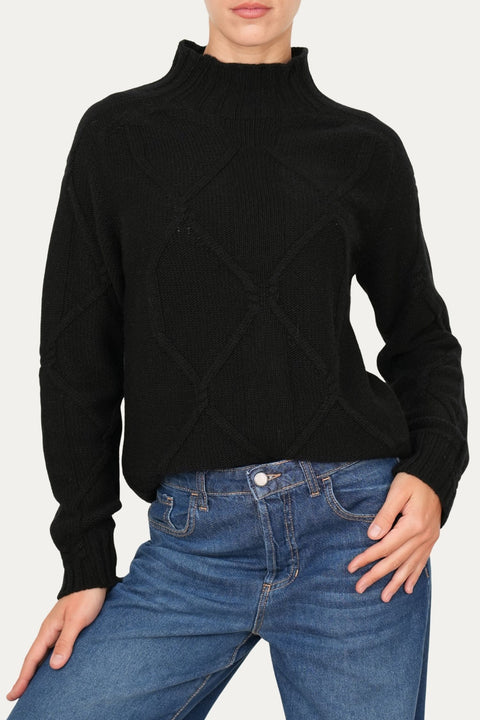 Questo maglione in maglia a rombi nel classico color nero è un capo che unisce raffinatezza e praticità, pensato per accompagnare con eleganza le giornate più fresche. La lavorazione geometrica dona movimento e ricercatezza al design, mentre il collo alto a coste aggiunge un tocco moderno e avvolgente. Realizzato in una pregiata miscela di lana e cashmere, arricchita da viscosa per garantire morbidezza, resistenza e comfort.