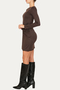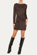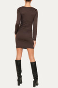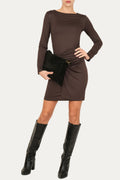 In una tonalità moro intensa e avvolgente, questo tubino esprime eleganza e carattere. Con la sua linea essenziale e il dettaglio intrecciato sul punto vita scolpisce delicatamente la silhouette. Il tessuto morbido ed elasticizzato valorizza le curve senza costringerle, creando un effetto slanciato e sinuoso. Lo scollo girocollo e le maniche lunghe lo rendono un capo versatile, femminile, sofisticato e sicuro di sé.